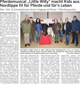 Die Redakteurin vom „Nordlippischen Anzeiger“ war da und hat ganz viele Fotos gemacht. Der Grund: unser Sponsor, Dr. Burghard Lehmann von der Osthushenrich Stiftung in Gütersloh sowie unser zweiter Geldgeber, der Landesverband der lippischen Reit- und Fahrvereine vertreten durch den Vorsitzenden Georg von Schönberg haben uns besucht. Beiden Organisationen sagen wir DANKE! Sie haben dafür gesorgt, dass die Kinder, die Ponys und wir Trainerinnen in den nächsten fünf Monaten ein tolles Musical auf die Beine stellen können. Lest selbst: