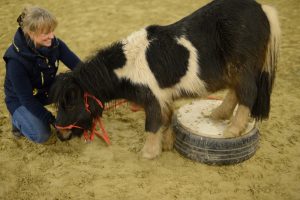 Wie man hier auf dem Foto mit Trainerin Kati sieht, ist das Podest nicht einfach nur eine Spaß-Übung. Das Rauf und Runter-Klettern ist auch Gymnastik für das Pony: die Bauchmuskeln werden gedehnt und die Hinterhand wird gestärkt.