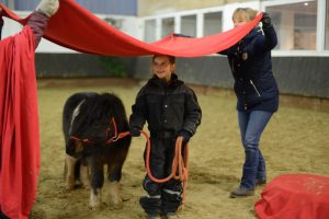 Ebenfalls im Rahmen der  Zirkuslektionen werden die Ponys auch an allerhand verschiedene Gegenstände gewöhnt – beispielsweise eine für Ponys durchaus bedrohliche, über ihnen flatternde rote Decke.